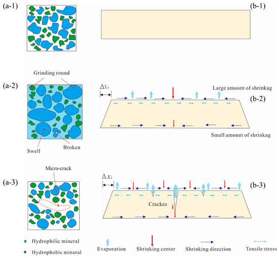 During wet–dry cycling, various microstructural changes promote the formation of potential microscale cracks. As cycling continues, these microscale cracks connect and merge with internal pores, leading to their progressive development [40] and ultimately culminating in the formation of visible mesoscale cracks. This also elucidates why the first wet–dry cycling exerted a substantial impact on the microstructure, yet did not give rise to numerous mesoscale cracks. From a mechanical perspective, mesoscale cracks belong to tensile cracks. The emergence and propagation of mesoscale cracks predominantly occur during the dehydration stage. In this process, The decrease in moisture content leads to an increase in soil matrix suction, resulting in the formation of tensile stress between particles. However, the specimen develops an internal water content gradient, as water loss from the surface exceeds that from the bottom [41]. Meanwhile, the extent of shrinkage among different mineral particles varies considerably, leading to uneven shrinkage of the soil, thereby inducing stress concentration (Figure 9(b-2)). When the tensile stress exceeds the soil’s tensile strength, internal cracks emerge and progressively develop [42].