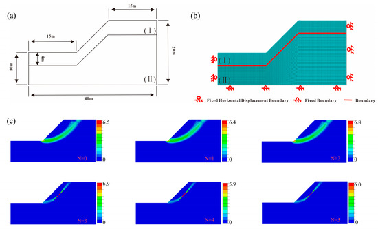 A typical homogeneous soil slope is used as a case study to investigate the impact of multiple dry and wet cyclic actions on slope stability, with the model geometry illustrated in Figure 10a. In a slope stability analysis, the influence of external environmental factors on soil strength is limited to a certain depth [50,51]. Consequently, the model is divided into two zones: the upper zone (Zone I), representing the affected area, and the lower zone (Zone II), representing the unaffected area. Zone I and Zone II constitute distinct regions within the same homogeneous soil body, delineated solely by the “Partition” function of the software. The disparity between these two zones manifests solely in the variation in material parameters, specifically cohesion (c) and angle of internal friction (φ), as a function of the number of N. No contact interface is established between the two zones. This approach circumvents the computational complexity associated with the contact algorithm, thereby reducing the computational workload, and precisely captures the progressive degradation effect of wet–dry cycles on the topsoil. The physical parameters of the soil used in the model are provided in Table 2. In Zone I, which is subjected to wet and dry cyclic actions, the shear strength is reduced, and the cohesion and angle of internal friction under varying cyclic conditions are determined based on the experimental results detailed in Section 3.4 of this study. In contrast, Zone II is not subjected to wet and dry cyclic actions, and its cohesion and angle of internal friction are taken as the values obtained from tests under natural moisture content, prior to any cyclic exposure.