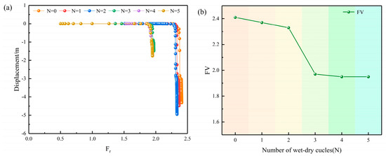 The calculated relationship between the slope’s top displacement (U) and Fr for varying N is shown in Figure 11a. In this study, the method proposed by Peng et al. [52] for assessing slope instability is employed, using the convergence of finite element calculations as the basis for determining instability. The final factor of Fv for the slope under varying N is presented in Figure 11b. From the figure, it is evident that, considering the deterioration of the geotechnical structure due to wet and dry cyclic actions, the factor of safety for the slope significantly decreases, from an initial value of 2.41 to 1.95 after five wet–dry cycles, representing a total reduction of 19.1%. It can be observed that in the first two cycles, there is a slight decrease in the slope’s safety factor, primarily attributed to the reduction in the cohesive force of the soil. Despite the notable reduction in cohesion observed during the initial two wet–dry cycles, the extent to which the external environment influences soil strength is constrained. This, in turn, leads to a lesser decrement in Fv and an elevated overall safety factor for the slope.