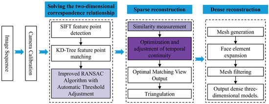 In summary, to address the issue of insufficient point cloud density in existing multi-view image 3D reconstruction algorithms, this study proposes a solution framework based on feature-matching optimization. By integrating the scale invariance of SIFT feature descriptors with the high-dimensional search efficiency of KD-Tree (resulting in a 68.5% reduction in matching time) alongside a self-designed dynamic threshold RANSAC optimization strategy (which enhances inlier selection accuracy by 23.6%), the experimental results demonstrate the algorithm’s exceptional performance across four datasets. This accomplishment demonstrates the synergistic efficacy of the adaptive RANSAC filtering mechanism and SIFT + KD-Tree feature space optimization, which effectively alleviates the issue of low model point cloud density caused by insufficient matching points during multi-view image reconstruction and provides a larger number of matching point pairs for subsequent multi-view geometric computations.