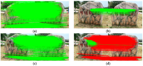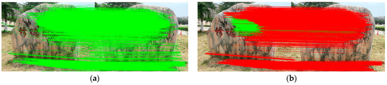 Figure 11b demonstrates the optimized results with our improved RANSAC algorithm: green lines represent matches under original thresholds, while red lines indicate additional matches from adaptive threshold adjustment. This highlights the algorithm’s enhanced robustness through increased valid matching pairs.