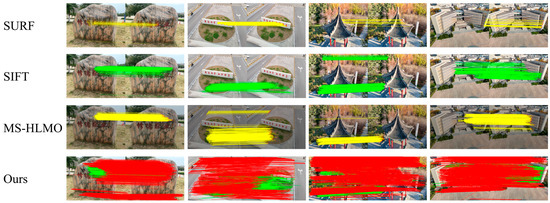 Figure 15 that across all datasets, our algorithm and MS-HLMO consistently outperform SIFT and SURF algorithms, particularly when it comes to matching accuracy. Consequently, our algorithm not only matches more point pairs when processing self-collected datasets but also achieves a higher matching accuracy when taking into account both the number of matched point pairs and matching accuracy, highlighting its superiority and potential in real-world applications.