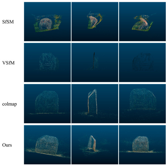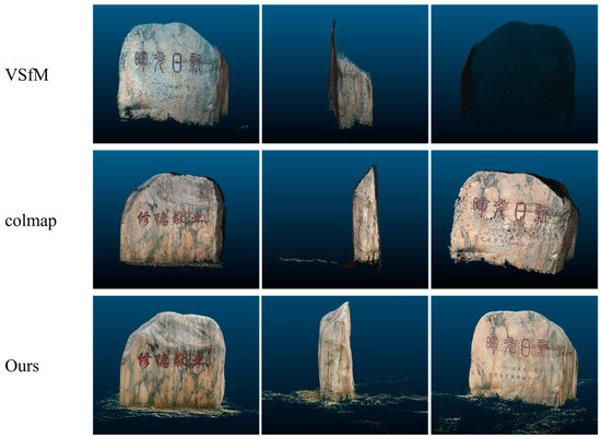 From the frontal perspective, the VSFM algorithm produces sparse point clouds with significant detail loss, while COLMAP increases point cloud density but still exhibits reconstruction blind spots. In contrast, the proposed algorithm generates uniformly distributed high-density point clouds, effectively capturing the statue’s textures and intricate details. In the lateral view, VSFM displays blurred outlines, and COLMAP inadequately handles complex geometries; however, the proposed algorithm achieves precise contour delineation and fine feature reconstruction. The rear perspective comparison is even more pronounced: VSFM suffers from extensive point cloud omissions, and COLMAP fails to provide complete coverage, whereas the proposed algorithm ensures full rear-view coverage.
