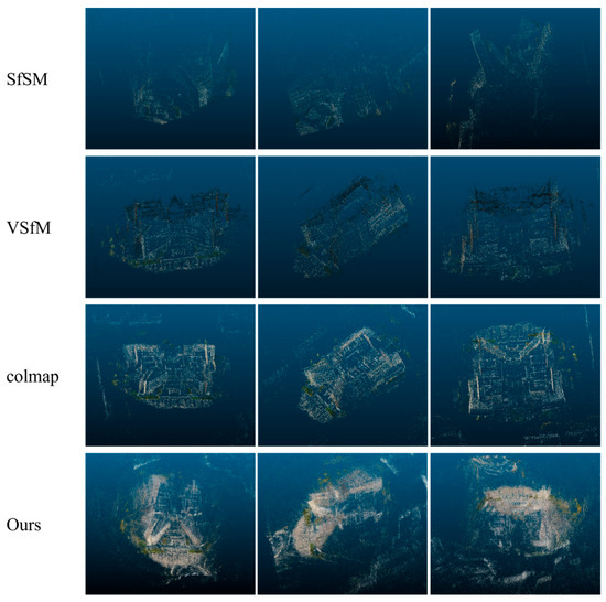 Through a comparative analysis from various perspectives, it is evident that the algorithm presented in this paper demonstrates significant improvements over VSFM and COLMAP in terms of point cloud quantity and detail reconstruction. The point clouds generated by VSFM appear relatively sparse across different viewpoints, resulting in the failure to recover numerous architectural details, which compromises the completeness of the reconstruction. Although COLMAP shows an increase in point cloud density, its performance in detail representation remains suboptimal, particularly concerning the textures and complex structures of buildings, failing to achieve the desired reconstruction quality. In contrast, the algorithm proposed in this paper not only generates a greater number of point clouds but also ensures a more uniform distribution, effectively capturing the intricate features of the architecture thereby enhancing the completeness and accuracy of the reconstruction across all perspectives.