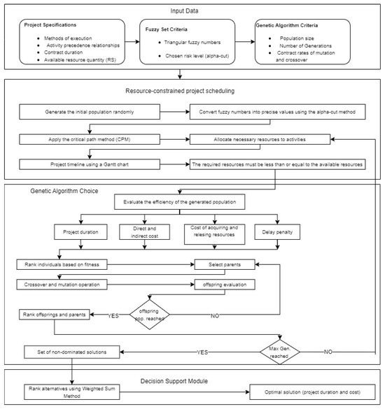20], who developed a two-phase genetic algorithm to deal with the time–cost trade-off as well. The proposed multi-objective model for both renewable and non-renewable resources to maximize the net present value and minimize project duration is based on the genetic algorithm and simulated annealing [