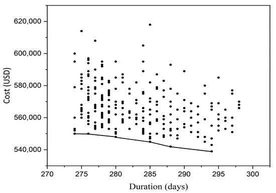Figure 7. The curve illustrates the relationship between cost and time, representing the non-dominated set of solutions that reflects the best achievable balance between these two factors. This set comprises the most efficient solutions, where no single criterion can be improved without compromising the other.