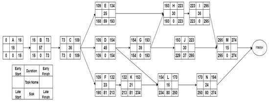 Figure 8 presents the project network, illustrating the execution time for each activity, the earliest start and finish times, the latest start and finish times, as well as the floating period duration.