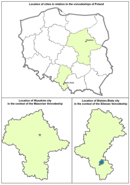 This study pertains to two Polish cities: Bielsko-Biała, located in southern Poland, and Wyszków, located in central Poland (Figure 2). Both cities differ in terms of size, population density, and hydrography. However, the authorities of both regions are committed to transforming their cities into more resilient and green areas. They are aware of environmental issues and the need for adaptation, although they lacked the data necessary to make informed decisions on where and what kind of actions are most needed.