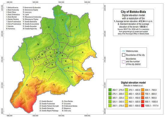 Bielsko-Biała spans an area of 125 km2 and is situated in southern Poland within the Silesian Voivodeship. According to estimates from the Central Statistical Office, the population in 2023 was 165,766 citizens, exhibiting a slightly decreasing trend of approximately −0.33% per year since the start of the 2000s. The city’s landscape is predominantly upland and hills. The mountainous terrain restricts urban expansion to the south, with elevation differences reaching over 800 m (from Klimczok at 1117 m above sea level to the Biała River valley at 262 m above sea level) (Figure 3). There are four major rivers, while most of the city lies within the catchment area of the Biała River. Additionally, the city is interspersed with numerous smaller surface watercourses, including seasonal streams that appear during spring thaws. The immediate vicinity of the mountain range, which stretches along almost the entire southern border of the country, offers a favourable microclimate and an attractive location for tourism and recreation. Green areas cover more than half of the city of Bielsko-Biała, with a green area stock ratio of 53%. According to data from the Central Statistical Office (2021), the area of forest land within the city of Bielsko-Biała is 3179.9 ha, which translates into a forest cover of 24.9% (the national average is 29.6%). The city is a multifunctional hub, recognised for its economic vitality, cultural richness, and scenic landscapes. The city’s current socio-economic development builds upon its centuries-old traditions in manufacturing and commerce. Its growth is facilitated by a substantial and receptive consumer market, a business environment, and a strategic location at the crossroads of major rail and road networks []. The spatial structure of Bielsko-Biała reflects its unique location on expansive hills with varying levels of urbanisation, interspersed with streams. This structure follows a band-concentric pattern and is bisected by the Biała River, which historically served as the boundary between the two cities: Bielsko and Biała []. In the XIX century, the spatial structure was rearranged due to a comprehensive urban regulation plan. The plan outlined the direction for the city’s spatial development in the 20th century, envisaging significant changes in both the spatial layout (e.g., the separation of building zones) and transport infrastructure (e.g., the construction of ring roads and the ‘straightening of curves’). Currently, the city is divided into 30 districts (Figure 3), which serve as auxiliary units of the municipality. These settlements vary significantly in both area and population density. The highest population densities are found in districts located in the central parts of the agglomeration, while the lowest densities are observed in settlements situated in the southern areas of the city. In general, the residential and commercial zones extend along both sides of the Biała River. The city is currently being affected by a process of suburbanisation. One reason for this is the situation in the residential property market. The increase in demand for residential units and houses led to an increase in demand by developers and individual investors for residential land. This situation caused a surge in land prices in large cities, including Bielsko-Biała, which prompted many investors to look for cheaper land outside the city or on its outskirts [].