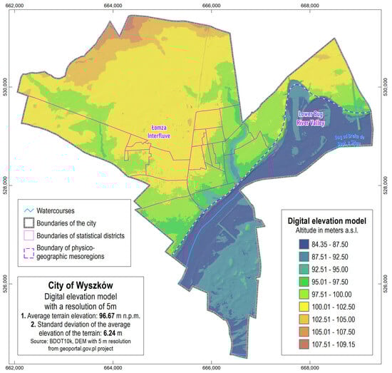 The landscape of Wyszków is characterised by moraine uplands on the right bank of the Bug River, which ascends to an average height of 100–120 m above sea level and descends steeply with an erosional edge towards the river (Figure 4). This edge has a relative height of 5 to 12 m, with gradients reaching up to 75%. Consequently, the Lower Bug River Valley within the study area displays notable asymmetry. The valley spans an average width of approximately 5 km, of which around 80% lies on the left bank. The left-bank section transitions smoothly into a flat terrain, with its boundary indistinctly marked by eolian deposits.