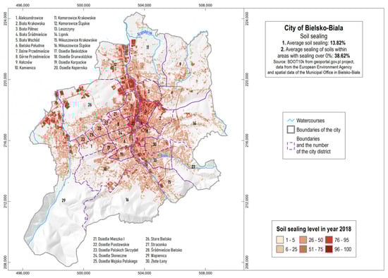 The spatial distribution of soil sealing in Bielsko-Biała City.