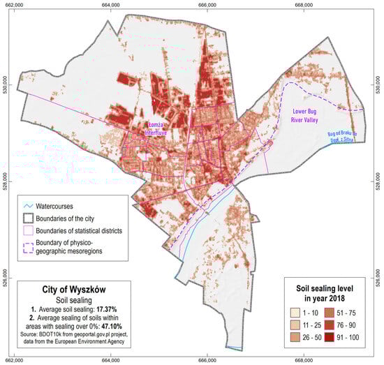 The spatial distribution of soil sealing in Wyszków City.