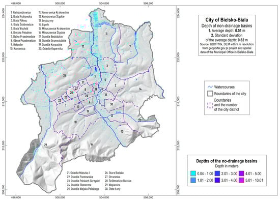 The localisation and depth analysis of potential non-drained urban basins in Bielsko-Biała City.