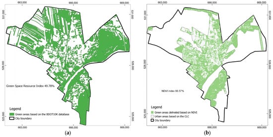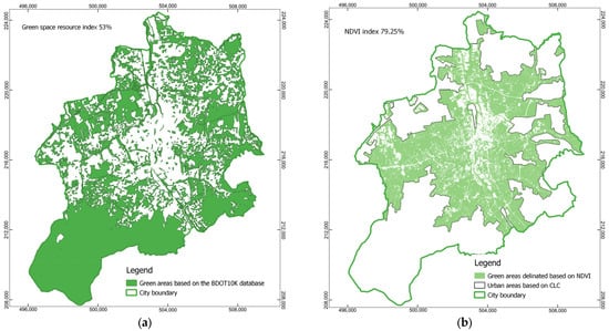 The map of green areas in Bielsko-Biała City consists of: (a) forests, shrubs, trees, and permanent crops based on the BDOT10K database, according to Equation (1); and (b) urban green areas derived from the NDVI index, according to Equation (2).