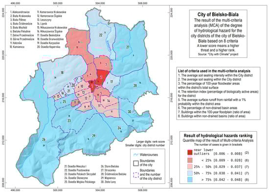 The ranking of Bielsko-Biała City districts according to hydrological hazards, as determined by the MCA analysis.