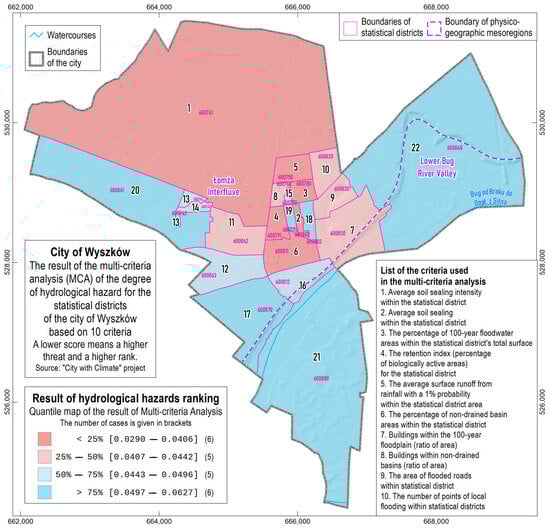 The ranking of Wyszków City districts according to hydrological hazards, as determined by the MCA analysis.