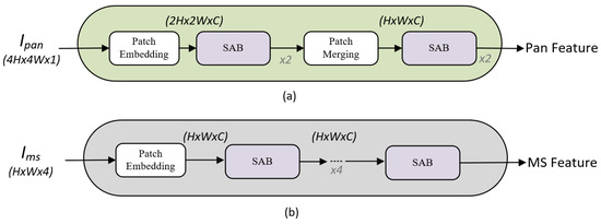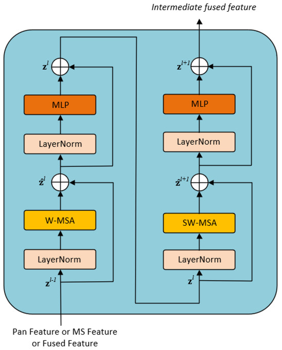 23]. This network employs a sliding window mechanism for feature extraction, which not only enhances computational efficiency but also significantly reduces the sequence length by performing self-attention calculations within the confines of each window. Simultaneously, the shifting operation enables interaction between adjacent windows, fostering cross-window connections across different layers. This design effectively facilitates a form of global modeling while maintaining computational efficiency. To capture the relevant information from PAN and MS images, the approach prioritizes the integration of key features. We incorporate the Swin Transformer and employ the shifting mechanism to facilitate interaction between the information. This leads to the proposal of the structure.