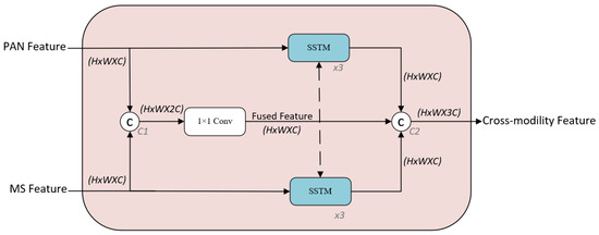 First, we feed the modality-specific features () of PAN and MS into CMFFM as inputs, respectively. Then, the PAN feature and MS feature are concatenated to obtain a fused feature () along the channel dimension. The number of channels is then adjusted to obtain the final fusion feature of size (). At the same time, the PAN feature and MS feature are separately fed into SSTM for further feature extraction. At this point, the size of the new PAN and MS features remains (). Finally, the new PAN and MS features are concatenated with the previous fusion features along the channel dimension to obtain the cross-modality feature as the output of CMFFM.