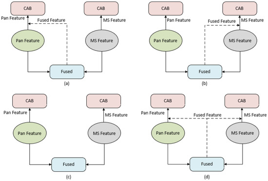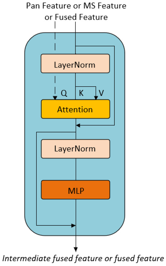 Figure 6. The PAN (MS) feature and the fused feature are fed into the CAB as the query (Q) and key–value (K, V) pairs, respectively. This strategy fully capitalizes on the distinct advantages of both MS and PAN, facilitating a more effective utilization of the correlative dependence and complementary information between spatial (spectral) features and their fused counterparts. The attention function CA (