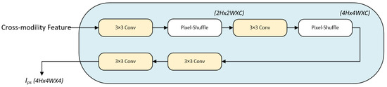 . Following several convolution operations and a pixel shuffle, the pansharpened image is generated at this stage, resulting in a size of