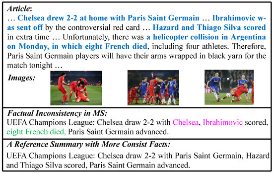 The factual inconsistency problem has been studied in text-only summarization tasks [4,5,6,7], where the generated summary is supposed to be consistent with the textual article. However, there is currently no work focusing on the factual consistency of MS. MS can also suffer from factual inconsistency problems that are more severe than those in text-only summarization since MS generates the summary from both the textual and visual modalities. The summaries generated by the existing MS models can distort or deviate from the meaning of the textual and visual content in the original documents, since they mainly focus on obtaining a high degree of word overlap with the textual content and do not consider consistency between the textual and visual input. As shown in Figure 1, without considering the factual information of the visual content, the summary at the top contains the sentence eight French died, which is abstracted from the helicopter collision event in the textual content. This summary deviates from the main idea of the multimodal content, since helicopter collision event is not reflected in the visual content and is not the main content when taking the two modalities as a whole. That is to say, the summary deviates from the visual input, which represents a visual inconsistency problem. Therefore, it is a great challenge to generate a multimodal factual consistency summary for the multimodal article, since the summary should be consistent to different modalities simultaneously.