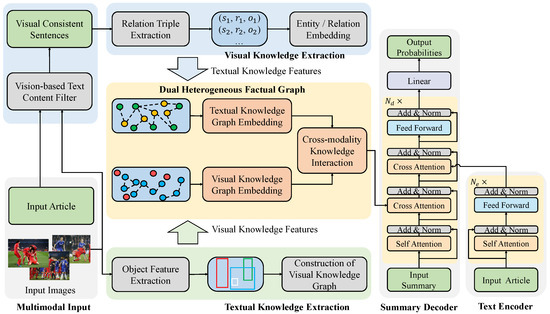 As shown in Figure 2, a transformer [32] encoder–decoder structure is employed as the multimodal summary generator to combine the textual and visual knowledge information and generate a multimodal factual consistency summary.