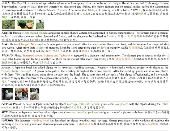 The Daily Mail and CNN datasets from MM-AVS [36] were sourced from the respective websites of Daily Mail and CNN. This dataset constitutes a comprehensive multimodal resource that encompasses documents, summaries, images, captions, and titles. It facilitates a robust comparison between multimodal summarization methods and traditional text-based approaches. HCSCL-dataset [19] is a Chinese multimodal summarization dataset. The textual data comprises diverse news articles sourced from TTNews [37] and THUCNews [38], spanning categories such as sports, entertainment, society, etc. Each article is accompanied by three pertinent images, with captions demonstrating the utmost relevance to the respective news titles.