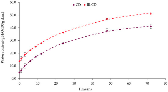The water vapor adsorption kinetics of black soldier fly powders processed by convective (CD) and infrared convective (IR–CD) drying methods. Dotted lines represent values obtained from mathematical modeling.