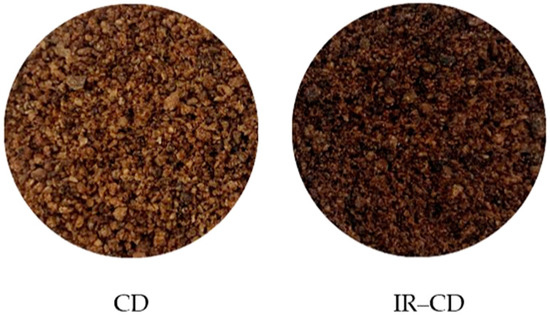The photos of black soldier fly powders processed by convective (CD) and infrared convective (IR–CD) drying methods.