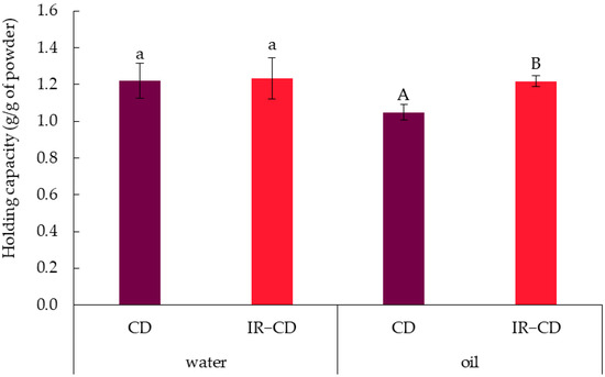 The water-holding capacity (WHC) and oil-holding capacity (OHC) of black soldier fly powders processed by convective (CD) and infrared convective (IR–CD) drying methods. The same letters above columns (small letters for WHC, capital letters for OHC) indicate no differences between the mean values (t-test, p < 0.05).