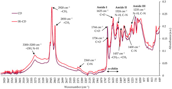 The FTIR spectra of black soldier fly powders processed by convective (CD) and infrared convective (IR–CD) drying methods.