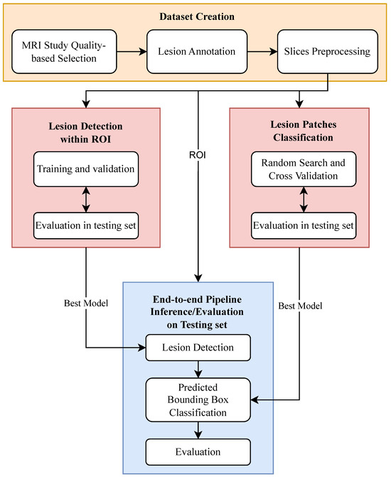 This study involved three main steps: dataset creation and preparation, model training and selection for lesion detection and classification, and end-to-end pipeline evaluation. These steps are briefly described in Figure 1 and will be detailed in the following subsections. The code developed to train, validate both detection and classification models, and test the end-to-end pipeline is available at https://github.com/bbg-fct/Adrenal-Adenoma-Detection-ML-Pipeline/tree/main (accessed 1 March 2025).
