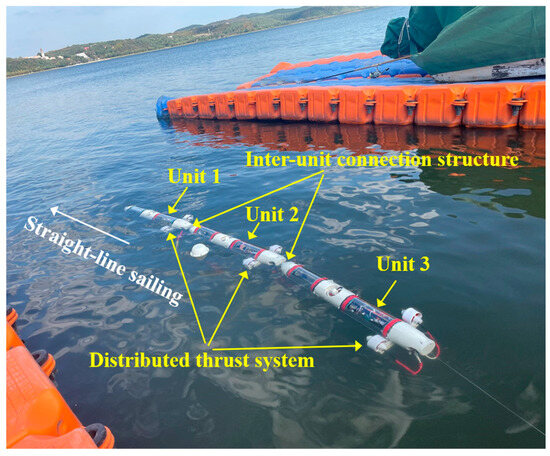 However, due to the distributed nature of the system’s propulsion, the relative motion and coupled dynamic effects between units make both overall speed control and inter-unit distance management particularly complex. The relative displacement between units not only impacts the system’s stability but also increases the risk of collisions and deviations from the planned trajectory, especially in high-speed or complex underwater environments. Ensuring steady straight-line motion thus becomes a significant challenge. Moreover, as the number of units’ increases, conventional thrust allocation methods lack the real-time efficiency needed for large-scale systems, highlighting the necessity of improving the efficiency of online thrust allocation methods.