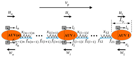 For the purposes of analysis, the following assumptions are made. The shape, center of mass, center of buoyancy, and thrust position of each AUV unit in the MATC system are identical. The initial state assumes that the gravitational force is equal to the buoyant force. The vertical motion is neglected, and the MATC system maintains horizontal straight-line motion during operation. The gravitational and buoyant forces of the inter-unit connection structure are negligible. The relationship between spring deformation and the force between units is accurately described. The thrust applied to each side of the units is synchronized and equal in magnitude. The distances between units are equal when the springs are undeformed. The thrust direction of each unit is forward, and all units share identical performance characteristics. These assumptions simplify the analysis while providing a foundation for the dynamic modeling and control strategy development.