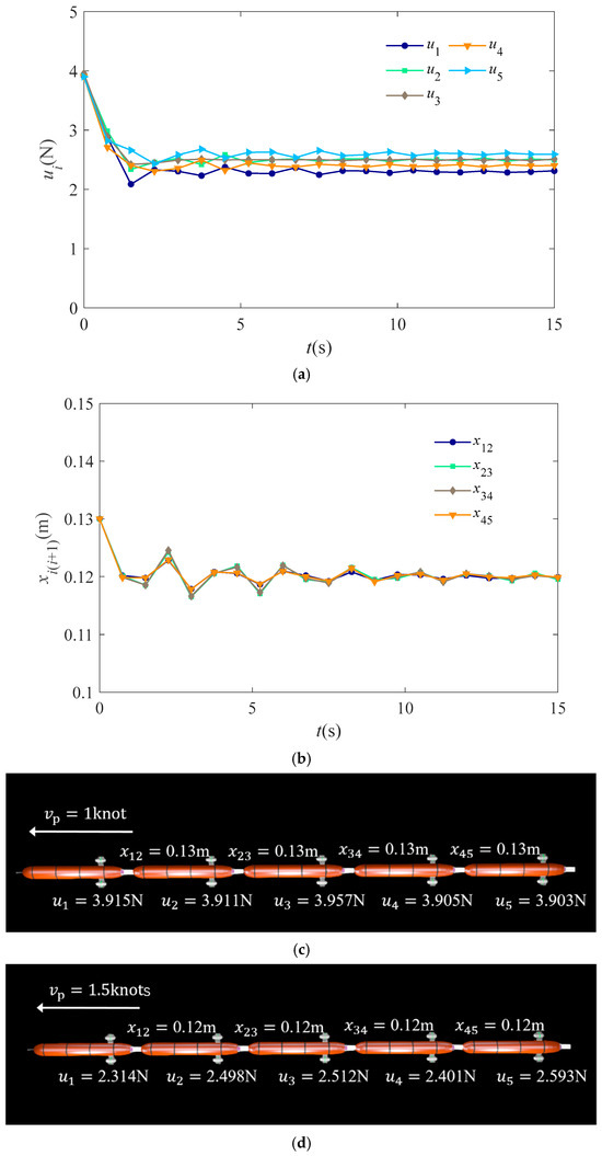 Figure 5 shows the variation in thrust allocation and inter-unit distances for the 5-unit MATC system under ocean current disturbances as it approaches stable straight-line sailing. Under the improved GA-driven thrust optimization, its thrust continuously adjusts over time to counteract the effects of the disturbance. The inter-unit distances of all units gradually converge from 0.13 m to the ideal 0.12 m.