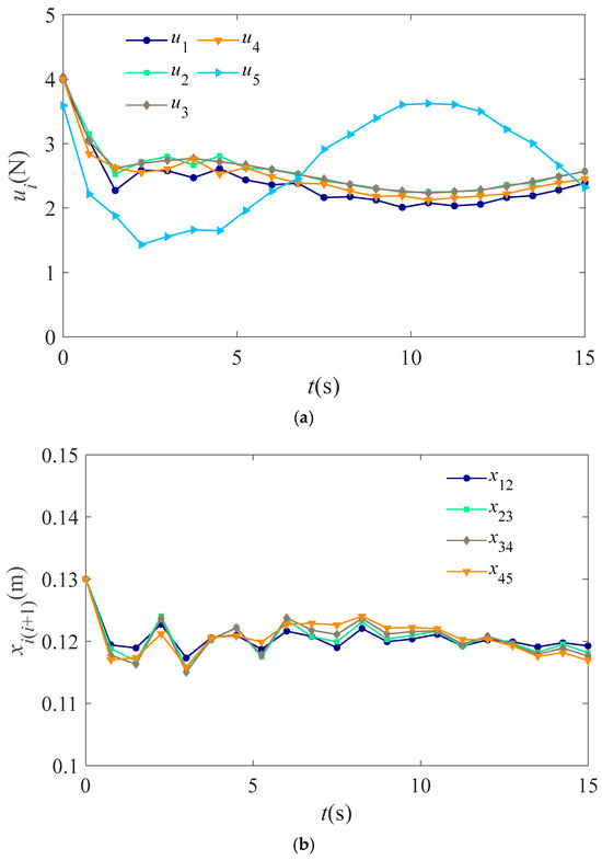 Table 3 presents the variation in thrust allocation and inter-unit distance over time with the penalty function applied. As shown, after the thrust allocation begins, the maximum thrust for all units, except for Unit 5, is 3.325 N, and the minimum thrust is 1.884 N, both of which satisfy the thrust saturation constraints. Furthermore, at 15 s, the inter-unit distances are all within the range of 0.122 m to 0.125 m, with a maximum deviation of 0.005 m, indicating an ideal convergence of the distances.