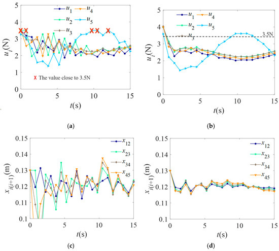 The thrust allocation and inter-unit distance variations for a 5-unit MATC system. (a) The thrust allocation results with the penalty function applied; (b) The thrust allocation results without the penalty function applied; (c) The inter-unit distance variations with the penalty function applied; (d) The inter-unit distance variations without the penalty function applied.