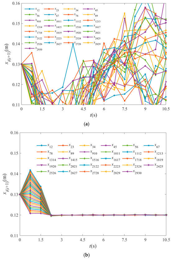 If the offline training process is excluded and the thrust optimization is directly performed using the improved GA, the inter-unit distance variation for the 30-unit MATC system is shown in Figure 7a. The inter-unit distance variation for the thrust distribution after offline training (HHO+BP) is presented in Figure 7b.
