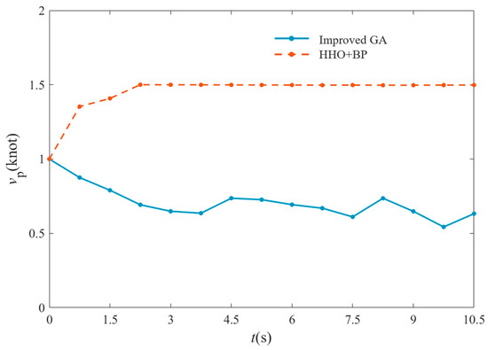 Figure 8 shows a comparison of the overall speed variations when directly using the improved GA and when using the offline training method. When the improved GA is applied directly, the straight-line speed fails to converge to the target speed. At 10.5 s, the overall speed is 0.66 knots (with a relative deviation of 56.00%). In contrast, when the offline training method is used, the overall speed quickly converges to the target speed of 1.50 knots.