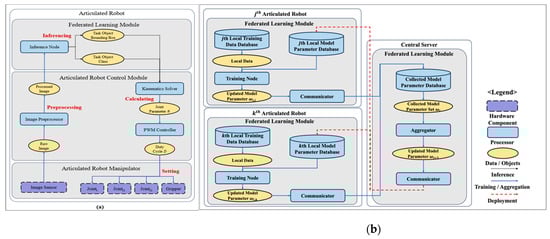 Overview of the proposed FL framework for articulated robot control: (a) picking process; (b) FL process.