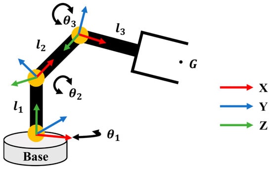 Coordinate system of the 3−DOF articulated robot (TRR-type); , , and represent the lengths of each joint; , , and indicate the angle of each joint; represents the coordinates of the end-effector.