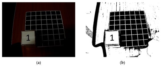Figure 4 shows sample images taken by a camera sensor attached to an articulated robot. After a picking object (i.e., a cuboidal part) is placed on a panel shown in Figure 4a, an adaptive threshold method based on the Gaussian filter is applied to the original image to improve the performance of the training and inference process of the trained client local model under limited power conditions and lighting effects (see Figure 4b).