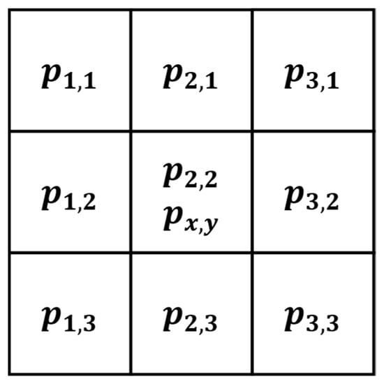 In Algorithm 3, let the central pixel coordinates of sub-area ( resolution) be represented as (). If the resolution of the sub-area is , sub-area s can be illustrated as Figure 5.