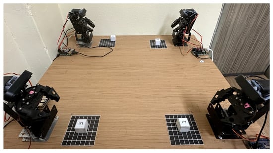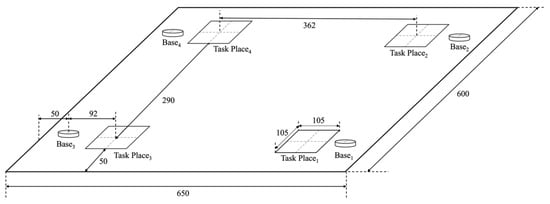 In Figure 8, Robotsi are installed on a table of 650 mm width and 600 mm height. The base of each robot is installed at a distance of (50 and 77.5) mm from the horizontal and vertical corners, respectively. The grid (i.e., Task Placei ) where the picking object of the articulated robot is located has the shape of a square with width = height = 105 mm, while the distance between the center point of each grid and the center point of the base is 92 mm.