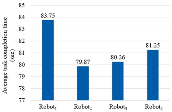 To evaluate the efficiency of the proposed robot control module, which derives joint parameters for picking tasks, the experiments were conducted over 30 iterations under the given condition (see Section 3.1). Figure 9 and Figure 10 present the results of the average picking task completion time () and average hardware resource share percentage () for the four articulated robots over 30 replications.