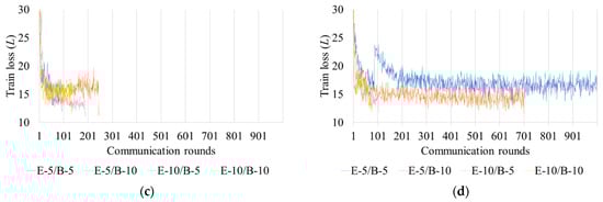 Training effectiveness as a function of the percentage of participating clients per round ( = {0.25, 0.5, 0.75, 1.0}), local epochs ( = {5, 10}), and mini-batch size ( = {5, 10}): (a) training loss versus communication rounds with C = 0.25; (b) training loss versus communication rounds with = 0.5; (c) training loss versus communication rounds with = 0.75; (d) training loss versus communication rounds with = 1.0.