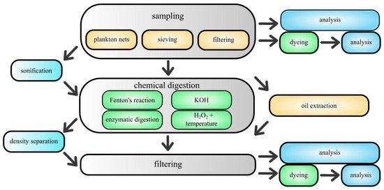 One of the greatest challenges in the study of microplastics (MPs) is the separation of them from other components of an environmental sample before the identification stage. Under magnification, microplastic particles resemble plant fibers, zooplankton, or sand grains. These elements are still present in the samples even after prior chemical digestion or filtration [85]. Researchers continually refine methods for separating MPs from samples taken from natural environments because samples are rarely suitable for direct analysis. This step is critical for subsequent quantitative analysis. The efficiency of the extraction method applied for MPs limits the results later. Figure 2 schematically presents commonly used practices in preparing environmental samples for MP analysis. Usually, a multistep sample preparation is required, employing mechanical, chemical, and other methods that exploit the physical property differences between plastics and other sample components [86,87]. Regardless of the subsequent identification method, the extraction stage of plastics from environmental samples is crucial to the accuracy and reliability of the results obtained. Plastics are distinguished by several parameters that separate them from natural materials. They have relatively low density, are mechanically durable, highly impact-resistant, and importantly, chemically resistant to acids, bases, and oxidizing agents [88]. This latter feature allows for the chemical digestion of samples to dissolve as much of the sample matrix as possible into simple substances and smaller fragments. The most commonly used methods for this purpose include Fenton reactions, enzymes, hydrogen peroxide, and acid or base solutions [87]. Hydrogen peroxide is particularly frequently used, both in combination with heating and in reactions catalyzed by Fe2+ ions. The variety of materials studied, e.g., water, soil, sediment, plant, and animal tissues, necessitates specifying methods and their specific applications.
