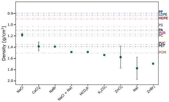 The applicability of saturated salt solutions in the process of density separation of microparticles of individual plastics. Plastics with a density lower than the density of the salt flow to its surface [103]. PP—polypropylene, LDPE—low-density polypropylene, HDPE—high-density polyethylene, PS—polystyrene, PA—polyamide, PUR—polyurethane, PC—polycarbonate, PVC—polyvinyl chloride, PET—polyethylene terephthalate, POM—polyoxymethylene.