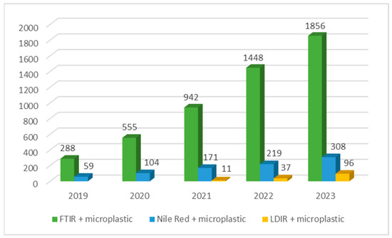 Number of scientific publications searched by the ScienceDirect portal tool using the keywords FTIR + microplastic, Nile Red + microplastic, LDIR + microplastic by year [121].