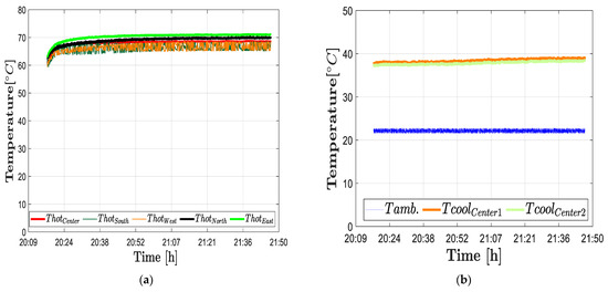 The experimental process conducted with the prototype is illustrated in Figure 5. The total experiment duration was 1.5 h, corresponding to 5400 recorded readings. It is important to note that experimental measurements were recorded only after the hot chamber reached the target setpoint temperature of 70 °C established for this study. Figure 6a shows the temperature behavior captured by the sensors positioned at the center, south, west, north, and east of the oak specimen throughout the entire 1.5 h test. It was observed that the temperatures exhibited minimal fluctuations and remained close to the setpoint value (70 °C). The ambient laboratory temperature and the temperatures measured on the cold surface of the specimen are shown in Figure 6b. The laboratory temperature remained approximately constant at 21 °C, while the temperatures on the cold surface of the specimen displayed smooth lines without disturbances, with a central value close to 38 °C.